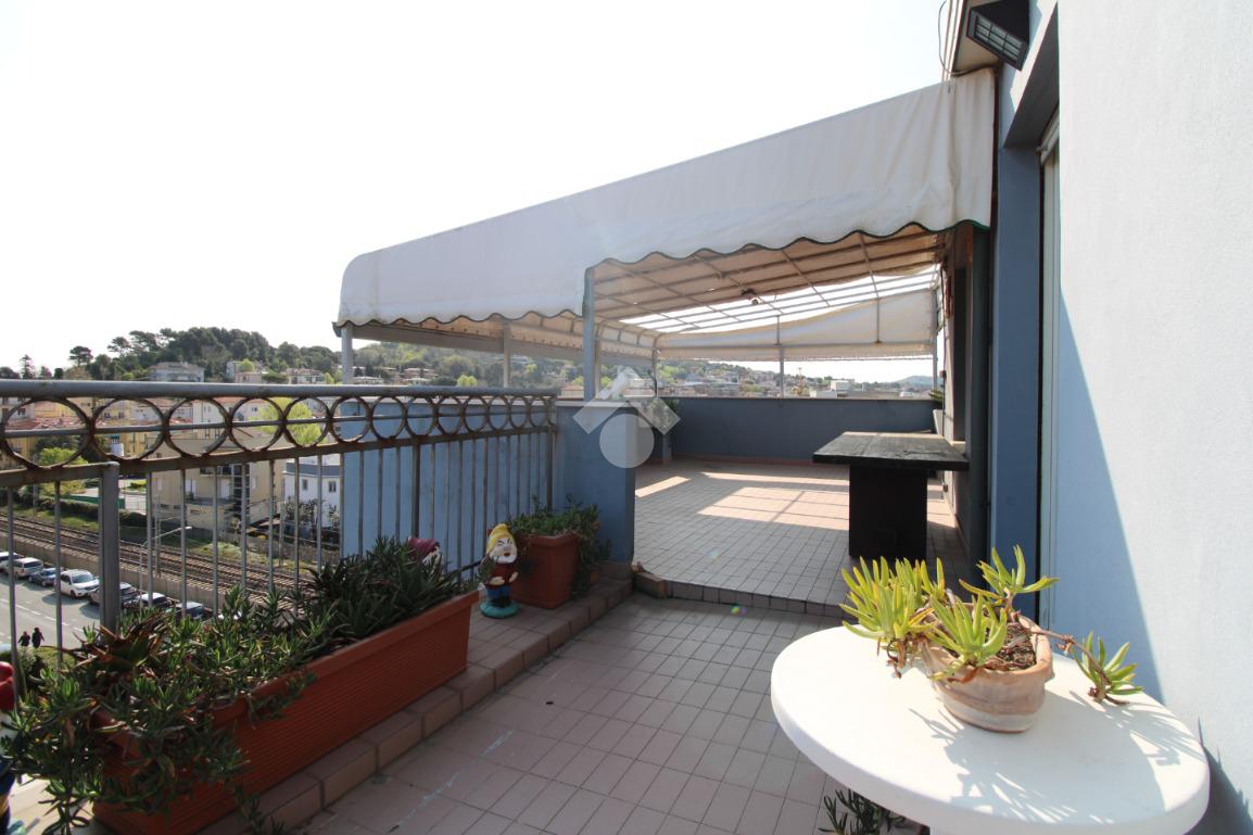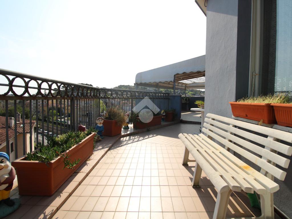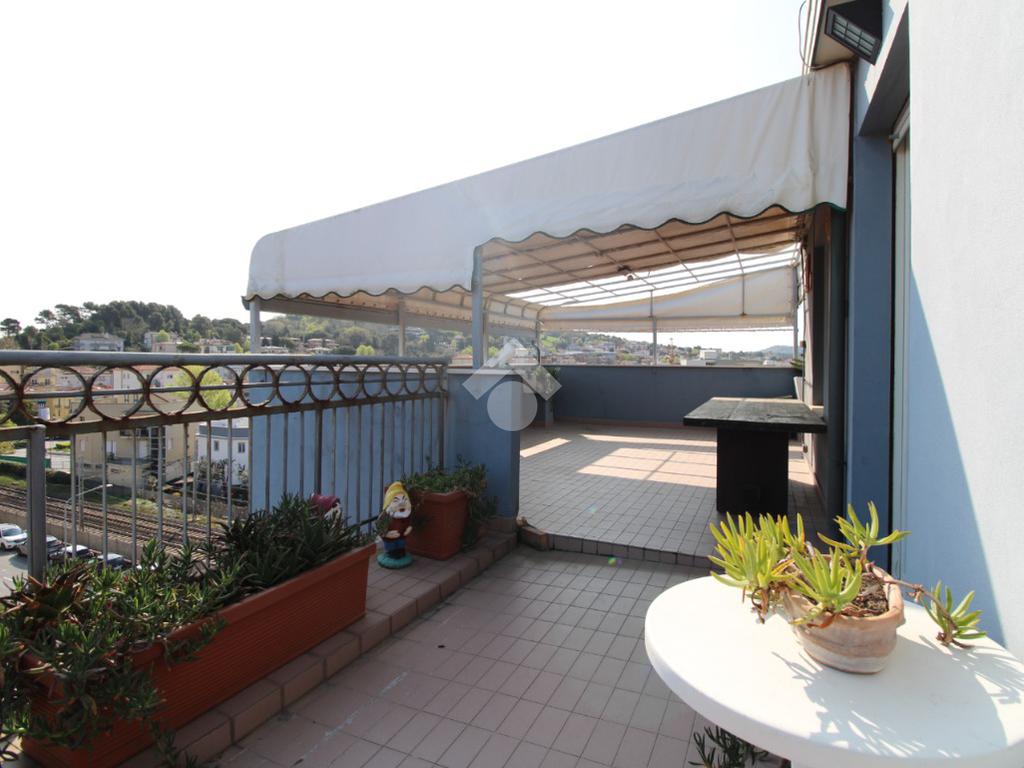 Lo spazio esterno, formato da un ampio terrazzo comunicante con i balconi, circonda l'intera abitazione e offre la possibilità di poter pranzare e cenare all'aperto godendo una visuale quasi totale della città e anche uno scorcio di mare.